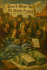 中世の群衆が『Don't Miss the AI Stock Frenzy!(AI株フィーバーを見逃すな!)』と叫び、現金とチラシ、イルカが舞う風刺的な構図。